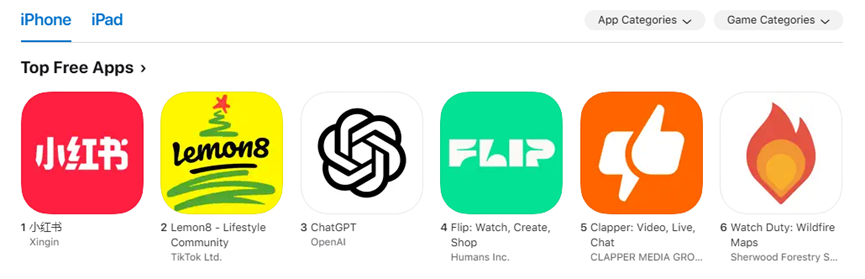 1月14日消息,据外媒报道,由于美国用户对TikTok禁令的担忧日益扩大,使得RedNote(小红书国际版)迅速在美国网络中走红,一举登顶苹果应用商店下载榜,紧随其后的是TikTok旗下的照片共享应用Lemon8和OpenAI的ChatGPT。